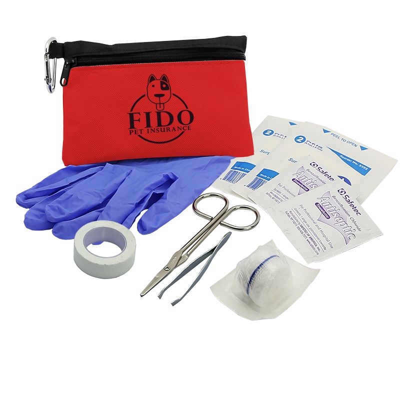 Be prepared for a pet emergency with our pet first aid kit! Includes: Two-tone 600D polyester zipper with 50mm carabiner clip, conform gauze roll, scissors, tweezers, gloves, first-aid tape, two gauze pads, and two antiseptic towelettes.  4" H x 6" W